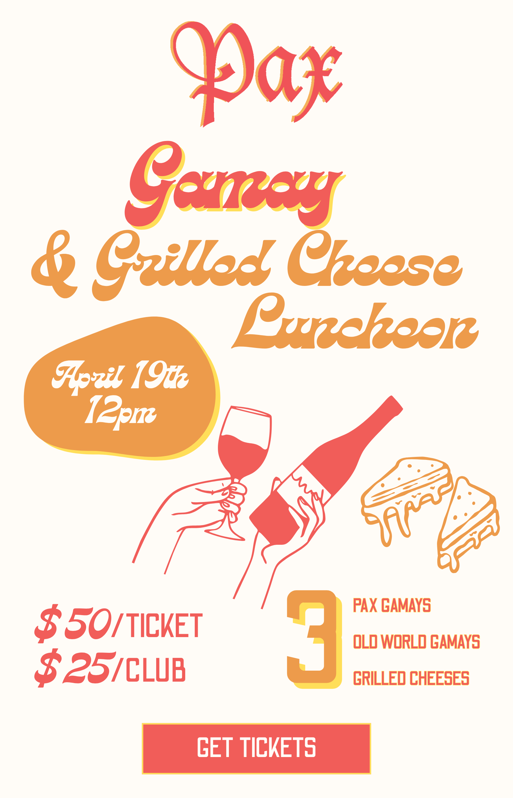 Guests will enjoy a guided tasting of three Pax Wines Gamay Noirs served side by side with three selections, curated by Pax Mahle, from Beaujoulais France. Following the tasting, wines will be enjoyed alongside a lunch of grilled cheese sandwiches. All guests are invited to bring along a bottle of Gamay to share with the table!